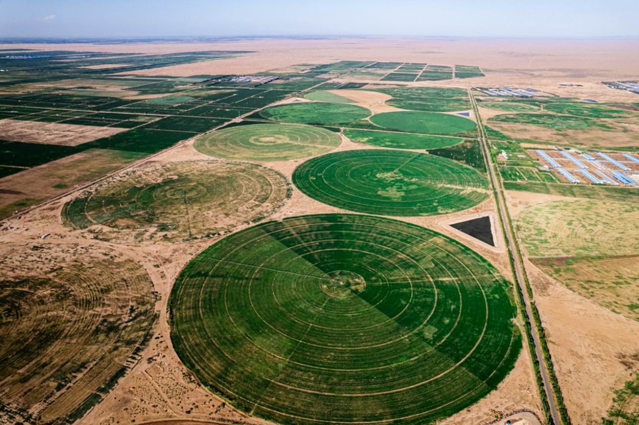 于是,在距離磴口縣直線(xiàn)距離約80公里的烏蘭布和沙漠腹地,人們歷經(jīng)十三年的建設,打造出了一片面積達200平方公里的綠洲。在這片綠洲上,不僅種植了玉米、燕麥和苜蓿——奶牛餐桌上必不可少的飼料,并建設了23座牧場(chǎng),養殖了10.2萬(wàn)頭奶牛,年產(chǎn)60萬(wàn)噸原奶。